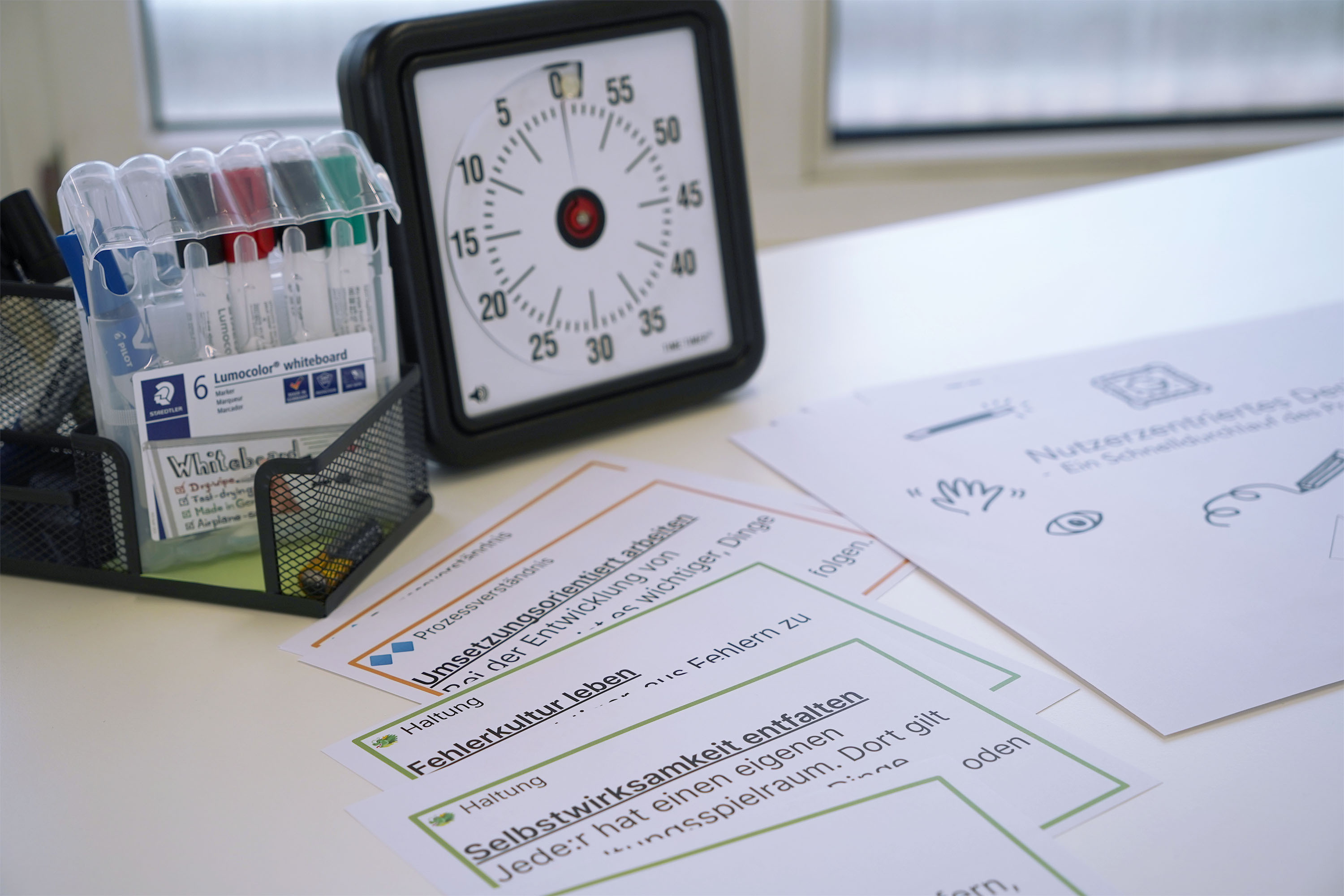 Statt wöchentlicher Termine blocken wir einmal monatlich einen ganzen Tag. Diese Sitzungen sind konzentrierter und komprimierter. Der Vorteil ist, dass die Teilnehmer:innen wirklich von ihrer normalen Arbeit abschalten und in einem anderen Raum miteinander in Kontakt treten können.