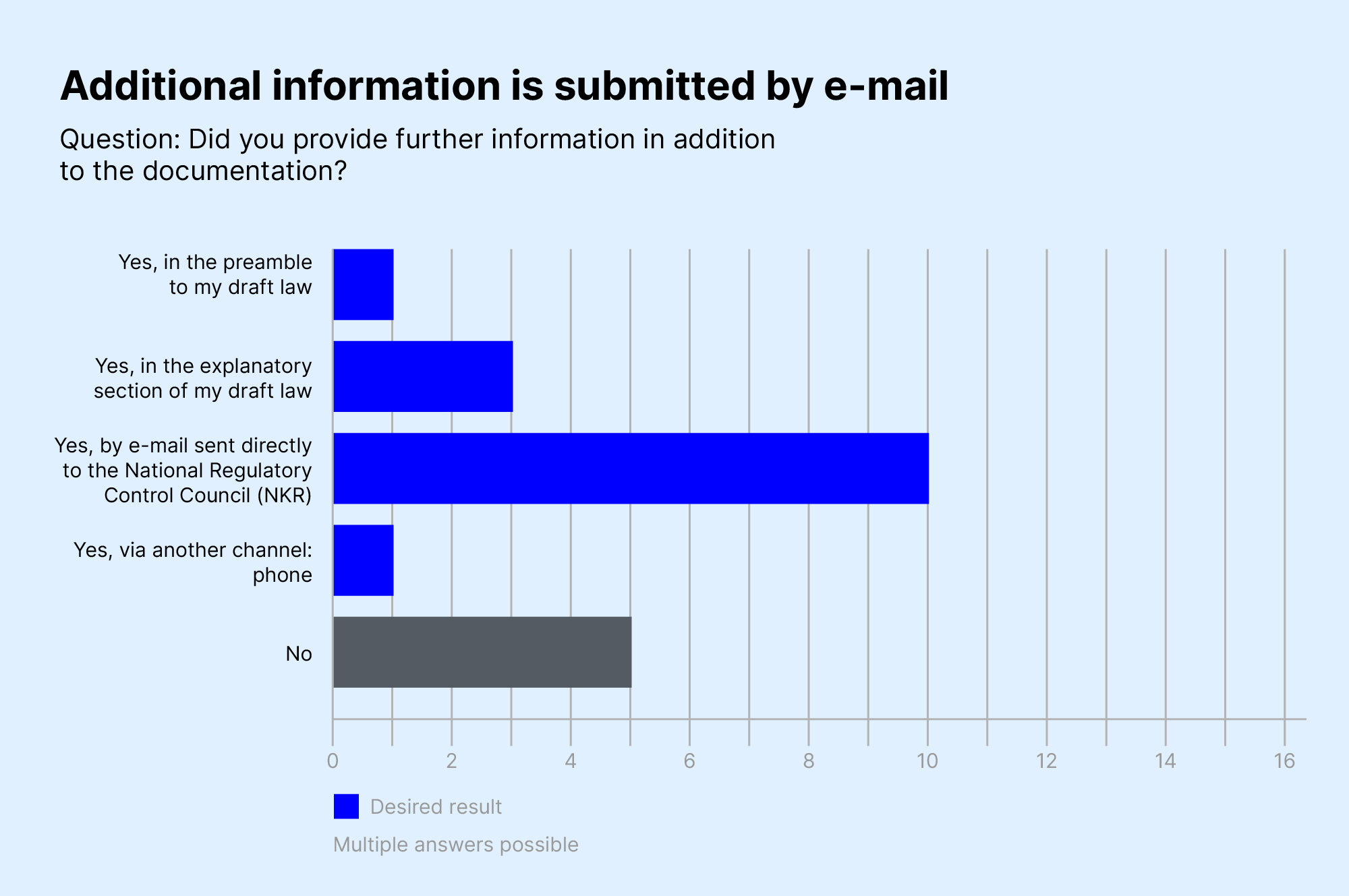 The online survey showed that the vast majority of policy drafters were sending further information on their policy plans to the NKR. Most did so by e-mail because the existing documentation at the time did not offer adequate ways to add further information. We changed this in the current version of Digitalcheck, adding fields for users to comment on reasons so all relevant remarks fit right into the accompanying Digitalcheck documentation for the NKR.